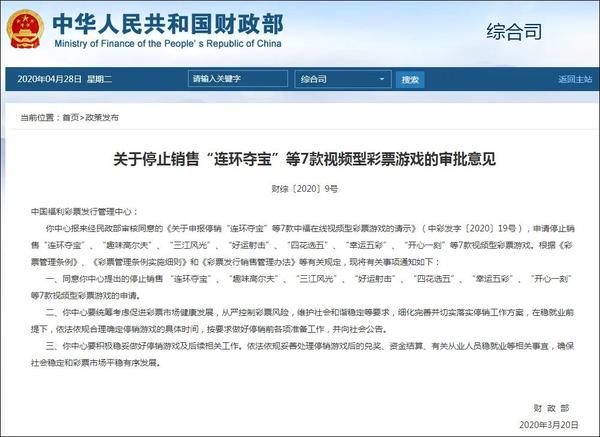 (观察者网讯)4月17日,财政部下发文件,同意了中国福利彩票发行管理中心提出的停止销售 src="https://pic2.zhimg.com/v2-f938b6269b1af21e40906df039d8a27d_b.jpg">